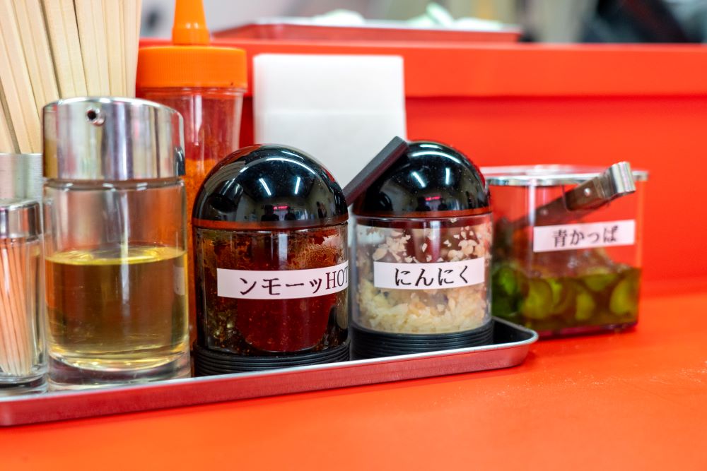 新宿だるま製麺が提供する平打ち麺は、モチモチの食感ながらツルっと滑り込むのど越しが抜群。麺に絡めながらスープの味を最高の状態で口まで運んでくれます。卓上には酢やにんにく、辛味調味料もあり味変もおすすめです。