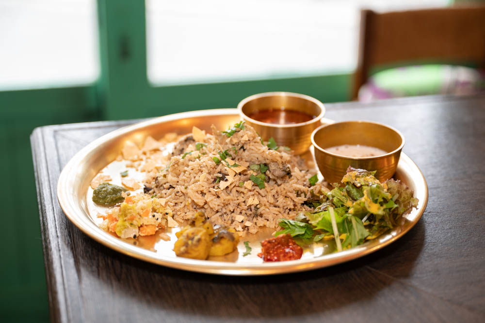 もう一つの人気メニューが、インド式炊き込みごはん「ビリヤニ」。スパイスとお米を一緒に炊き上げる料理で、提供される種類は月替わり・日替わりで変わるそうです。この日のビリヤニは南インド発祥の「コングナードゥ・ヴェッライ・ビリヤニ」。ココナツミルクで炊き上げることで、しっとりとまろやかな口当たりに仕上がります。グリーンチリ、カルパシ、シナモンなどのスパイスを使っていますが、辛さはほとんどなく、優しい味わいが楽しめます。