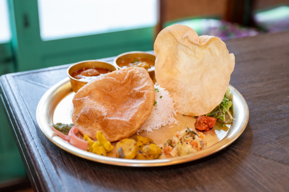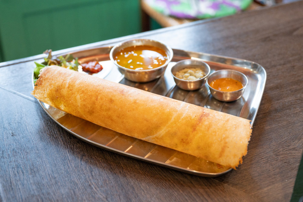 ほかにも南インドの伝統料理「ドーサ」も人気の一品。米とウラド豆を発酵させた生地を薄くクレープ状に焼いたもので、香ばしく軽い食感が魅力です。こちらは水曜日と土曜日限定の提供。聞き馴染みのある料理から、初めて耳にするメニューまで揃っており、さまざまな味わいを楽しむことができます。