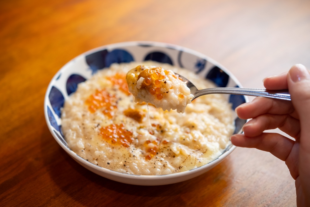 締めの一品としては、おでん出汁を使った「ウニいくらリゾット」がNo.1人気。おでんの出汁と生クリームを混ぜて作るリゾットは、出汁の旨味をベースに生クリームのコクが加わり、優しく上品な味わいに。2人で分けてちょうど良い満足感で、おでんを楽しんだ後の締めとして最高の一皿です。