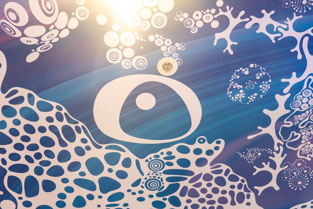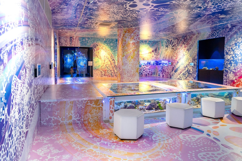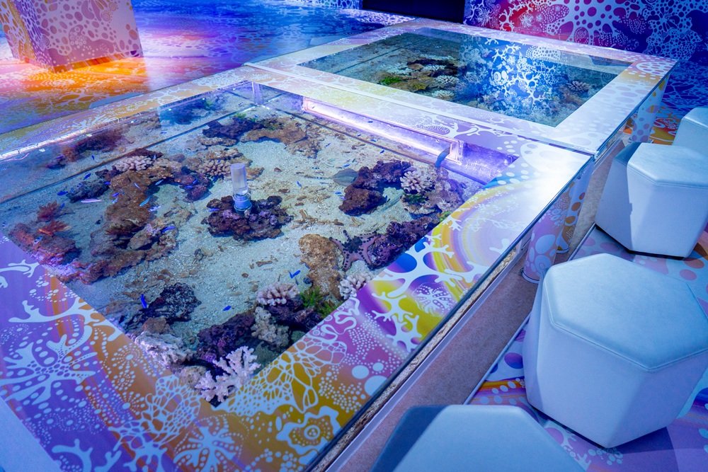 サンゴ礁が壁一面に描かれ、海中の多様さをイメージさせるエリア。注目すべきは、スペースの中央に配置されたテーブル型の水槽。周りに置かれている椅子に座って、上から生き物を見ることができます。