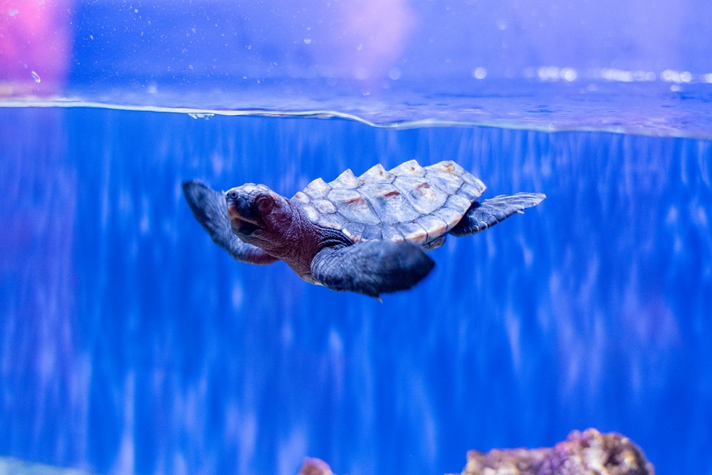 「Coral」エリアの水槽にいるアカウミガメ。高知県の『むろと廃校水族館』からやって来た、2025年8月に孵化して産まれたばかりの赤ちゃんです。ウミガメは成長スピードが速いため、赤ちゃんの頃の姿が見られるのは貴重なのだとか。(写真は1月中旬頃の様子。当記事公開時にはさらに成長しています)