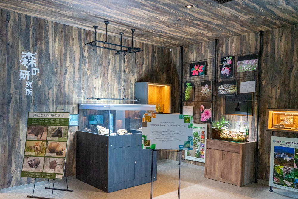 『広島もとまち水族館』は、水族館でありながら水生生物以外の生き物も展示されているのが特徴の一つ。水生生物と一緒にミーアキャットやカメレオンなどもいる「Forest」エリアの一角に、この「森の研究所」があります。
