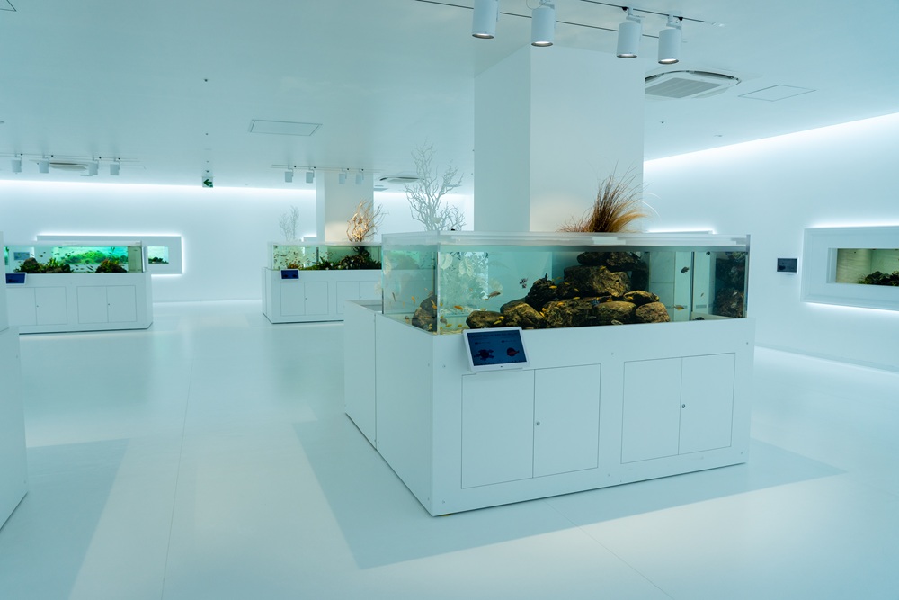 真っ白な空間に水槽が配置された、静寂な雰囲気に包まれたエリア。ここまで白く明るいエリアを設けている水族館は、全国的に見ても珍しいそうです。