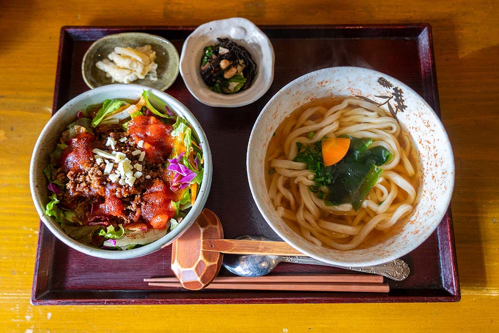 一見、うどん屋さんでタコライス?と感じるメニューですが、店主・岩川さんの奥様が沖縄が好きで、よく作っていた家庭料理がきっかけだそう。この見慣れない一品が学生からも大人気。セットには、出汁の取り方や調理法を試行錯誤しながら完成させたこだわりのうどんに、タコライスと小鉢が2つ付きます。うどんは離乳食期の赤ちゃんでも食べられるほどやさしい味付けになっています。