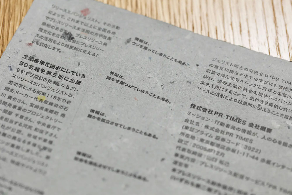 廃棄コストのかかっていた素材が紙となり、名刺や会社案内として企業の顔になって、誰かの手に渡る。素材のストーリーを知った受け取り手との間に会話が生まれ、手元に残り続ける。そんな循環が、「めぐる、手漉紙。」の力です。