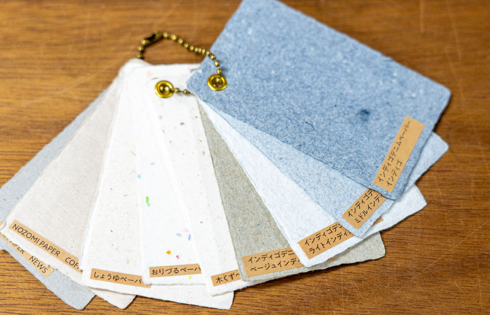 現在のラインナップは14種類。府中味噌の製造過程で出る大豆の皮を混ぜた「味噌ペーパー」、府中の木工産地の削りくずを使った「木くずペーパー」。そして広島市の福祉作業所では、平和公園で毎年焼却処分される折り鶴の一部を材料にした紙づくりにも取り組んでいます。